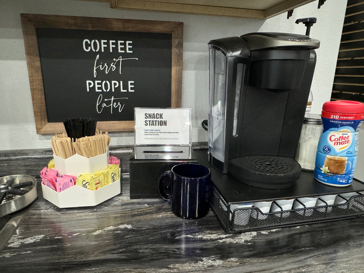 On site, you will find a large assortment of colored card stock, adhesives, and basic paper craft supplies readily available for purchase. We also provide a well stocked snack bar that has goodies available for a nominal fee.